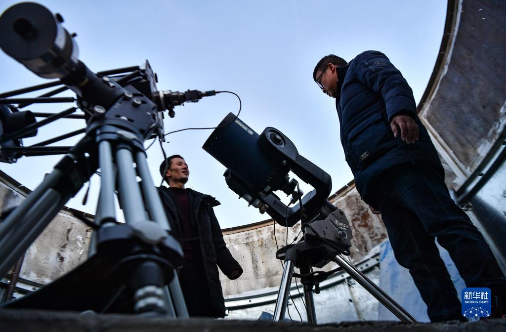 尤顯龍(左)和同事唐鵬在調試望遠鏡(5月23日攝)。新華社記者 晉美多吉 攝