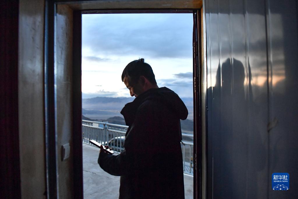 工作之余,尤顯龍用手機與家人聊天(5月24日攝)。新華社記者 晉美多吉 攝