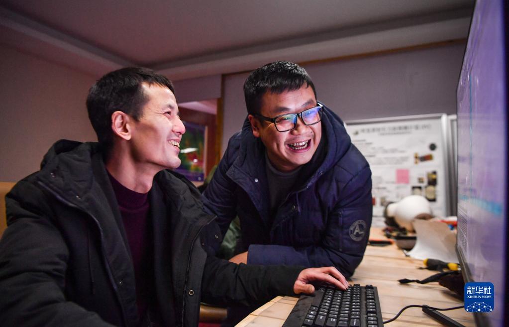 尤顯龍(左)和同事唐鵬在討論觀測到的數(shù)據(jù)(5月23日攝)。新華社記者 晉美多吉 攝