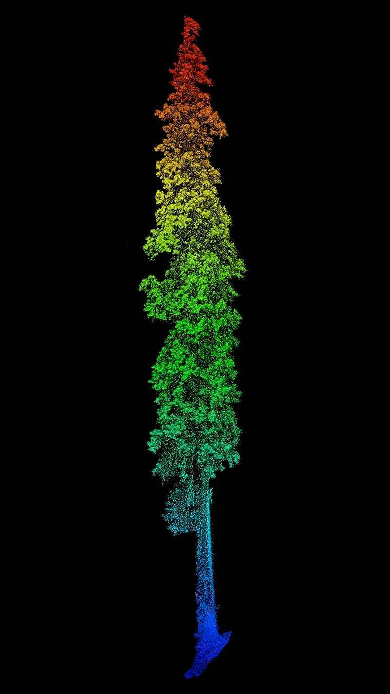 通過無人機與背包激光雷達相結(jié)合,對西藏柏木巨樹聚生區(qū)域進行精準測量,得到了巨樹群的精準三維點云模型。經(jīng)過高度測量,發(fā)現(xiàn)其中一棵西藏柏木高達102.3米,該發(fā)現(xiàn)同時刷新了中國與亞洲的最高樹紀錄,躋身按樹種排名的世界最高樹列表,位列第二。研究團隊獲取了該樹的精細三維點云數(shù)據(jù),測量其胸徑為293厘米,并采用無人機攝影的方式獲取了巨樹等身照。