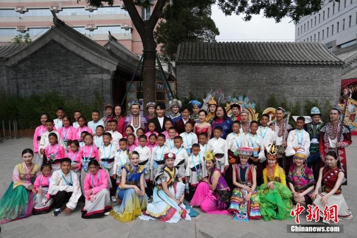 6月1日,來(lái)自青海省玉樹(shù)藏族自治州兒童福利院的40名藏族青少年參觀中華民族共同體體驗(yàn)館。圖為孩子們與參加演出的多民族藝術(shù)家們合影。中新社記者 崔楠 攝
