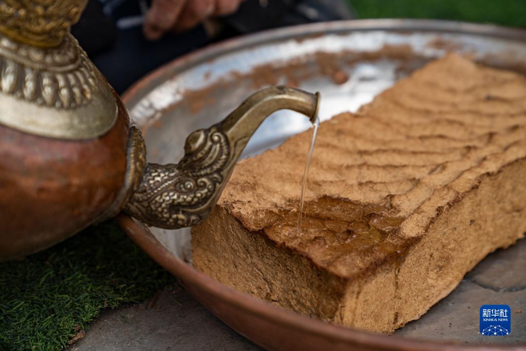 在西藏尼木縣吞巴鎮(zhèn)吞達村,次仁多吉用水浸潤晾曬后的香磚(6月9日攝)。新華社記者 孫非 攝