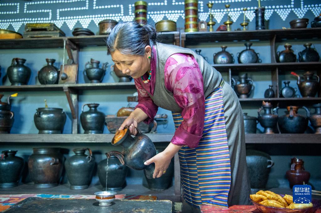嘎多在非遺就業(yè)工坊中查看青稞酒的質(zhì)量。新華社發(fā)(旦增努布 攝)
