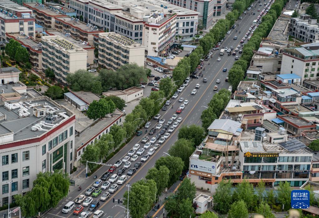 這是拉薩市街道上的車流(6月15日攝)。新華社記者 孫非 攝