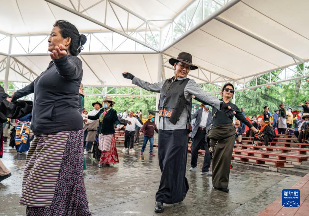 在宗角祿康公園,市民們跳起鍋莊舞(6月14日攝)。新華社記者 姜帆 攝