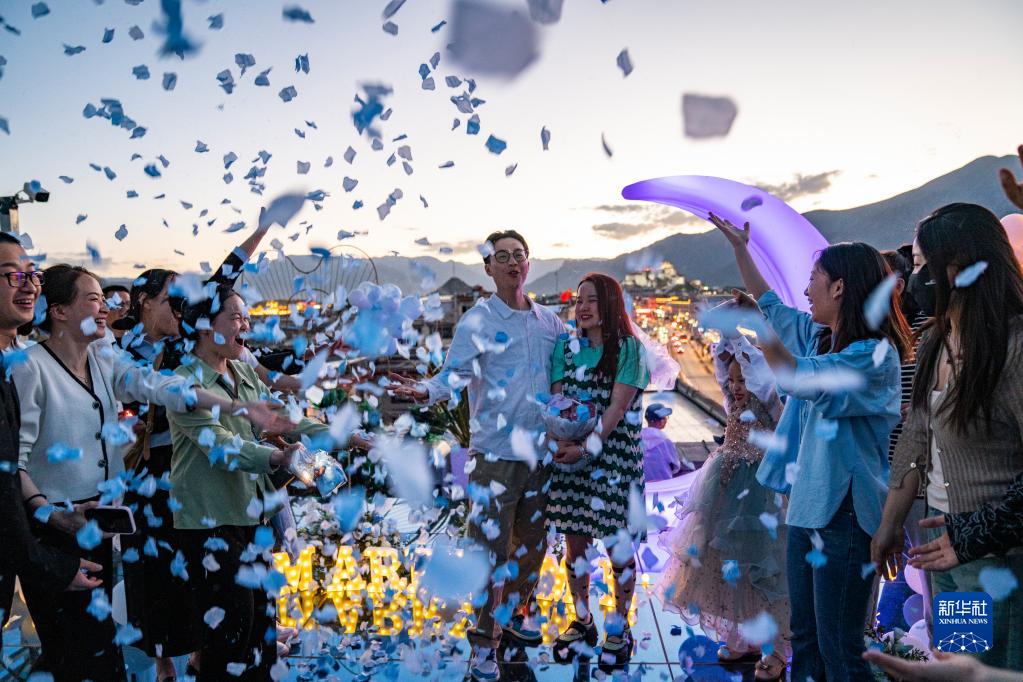 在八廓街附近的一家餐廳樓頂舉行的求婚儀式(6月7日攝)。新華社記者 孫非 攝
