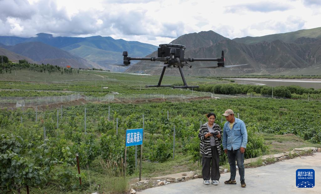 7月26日,桑日縣一家葡萄酒企業(yè)的員工曲珍(左)在葡萄園里向技術(shù)員何志榮學(xué)習(xí)使用農(nóng)用無(wú)人機(jī)。新華社記者 姜帆 攝