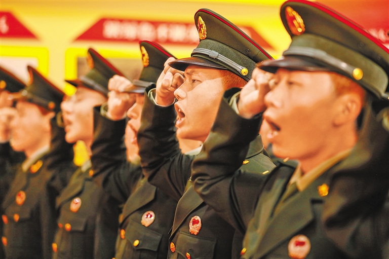 西藏軍區(qū)保障部某管線(xiàn)大隊(duì)組織新兵重溫入伍誓詞,激勵(lì)大家不忘初心、建功軍營(yíng)。胡強(qiáng) 石建 劉雪峰 攝