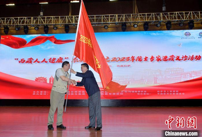 8月9日,“西藏人人健康”2023年院士、專家進(jìn)藏義診活動啟動儀式上,西藏自治區(qū)副主席甲熱·洛桑丹增(圖右)為義診專家團(tuán)隊代表授旗。李林 攝