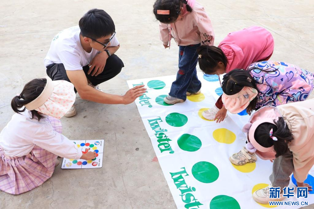 中國農(nóng)業(yè)大學峰云社人文科考隊隊員帶領孩子們進行課外活動。新華社發(fā)