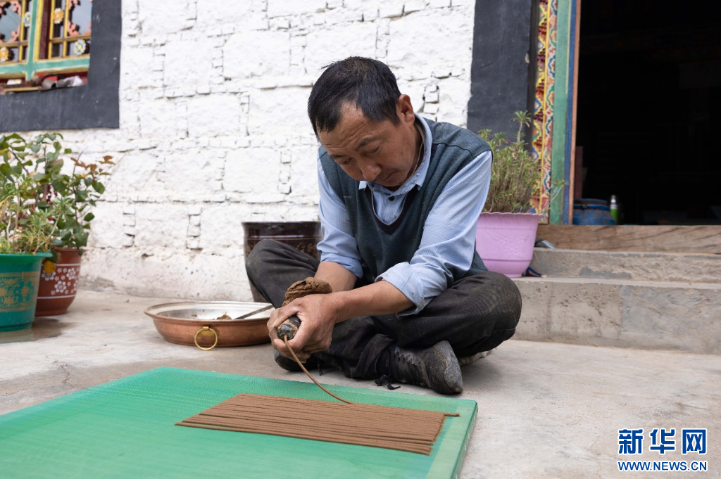 工作時,格桑次仁會盤腿坐于門前,熟練地揉搓著盆中的香泥,待其成型后再迅速放入帶孔的牛角中,用靈巧的手指擠出一道道筆直的線條,一根根均勻的藏香便呈現(xiàn)在人們的眼前。經(jīng)過晾曬成型之后,這些藏香將會被送至附近的大小寺廟,或是通過電商渠道發(fā)往全國各地。