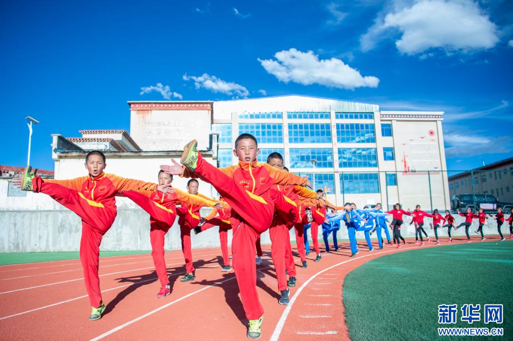 圖為那曲市第三小學(xué)學(xué)生在做體能訓(xùn)練(9月5日攝)。新華網(wǎng) 旦增努布 攝