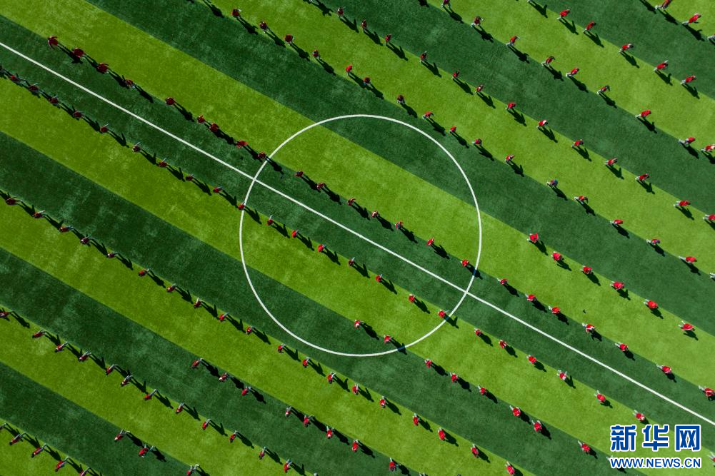 圖為那曲市第三小學(xué)學(xué)生在做體能訓(xùn)練(9月5日攝,無(wú)人機(jī)照片)。新華網(wǎng) 旦增努布 攝
