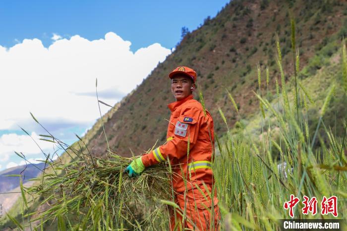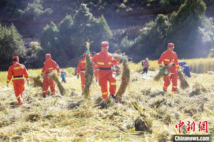 圖為消防員收割后搬運(yùn)青稞。劉星文 攝