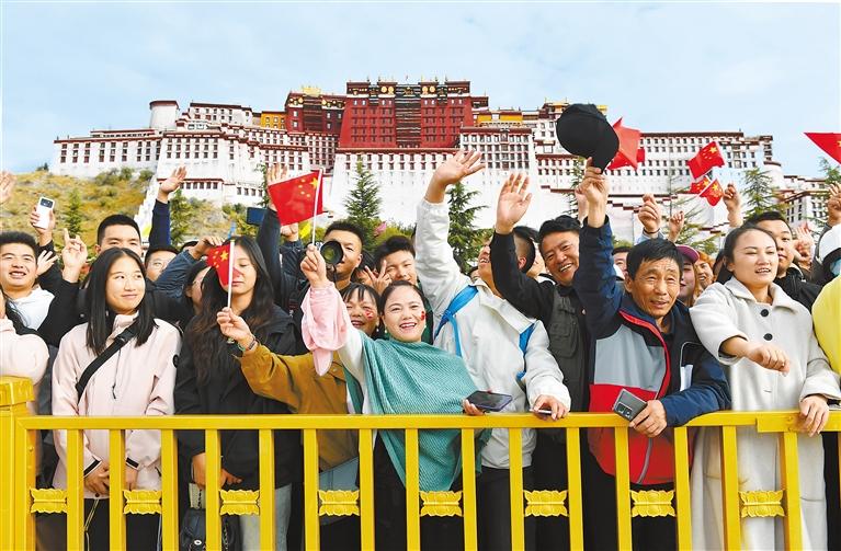 10月1日上午,西藏自治區(qū)慶祝中華人民共和國成立74周年“升國旗、唱國歌”儀式在布達拉宮廣場舉行。圖為群眾在觀看升旗儀式。記者 次仁平措 攝