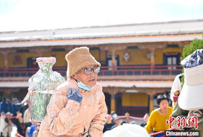 人群中的志愿者旺久來(lái)自山南市,自己做生意。他說(shuō):“放下家里的事情,過(guò)來(lái)朝佛也幫忙粉刷,帶了牛奶過(guò)來(lái),后面幾天也要參加?!?/p>