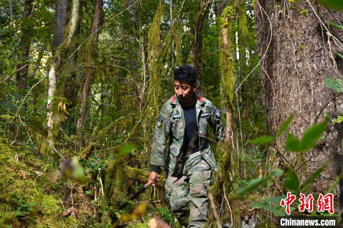 3名管護(hù)員到達(dá)格當(dāng)鄉(xiāng)最深處的一片原始森林。正值深秋,對于管護(hù)員們來說是最好的季節(jié),雨季結(jié)束,蚊蟲也少。他們僅帶了背包和道具,管護(hù)站副站長索朗羅珠說:“今天不用過夜,帶的裝備很簡單?!?/p>