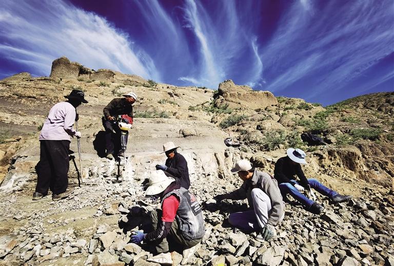 第二次青藏科考期間,中國科學院西雙版納熱帶植物園研究員蘇濤帶領(lǐng)的“生物與高原隆升協(xié)同演化”專題的科考分隊,從2017年開始在拉孜開展了多次考察研究,在西藏自治區(qū)科考辦和當?shù)卮迕竦膮f(xié)助下,最終在柳鄉(xiāng)發(fā)現(xiàn)了化石點并采集少量巖石樣品。