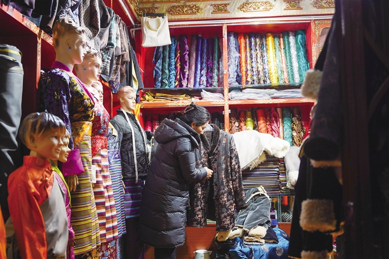 藏裝具有悠久的歷史,也在不斷演變、發(fā)展和豐富。過去人們穿的大都是氆氌織成的藏裝,樣式比較單一,清洗也不太方便。而隨著生活水平的提高,真絲面料、改良款等兼具民族特色與時尚色彩的新式藏裝深受人們的喜愛?!皞鹘y(tǒng)藏裝穿起來比較繁瑣,所以我一般都是過年或參加婚禮時穿。日常我主要穿改良藏裝,這些藏裝既有民族特色,又緊跟潮流,設計有新意,我很喜歡?!崩_市民尼瑪說。