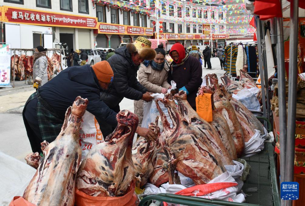 12月13日,在西藏日喀則市康馬縣冬季物資文化交流會(huì)上,當(dāng)?shù)厝罕娫谫?gòu)買(mǎi)羊肉。新華社記者格桑朗杰 攝
