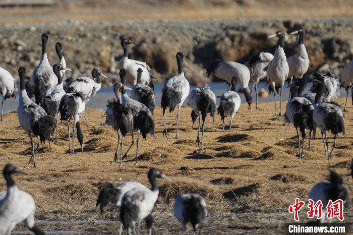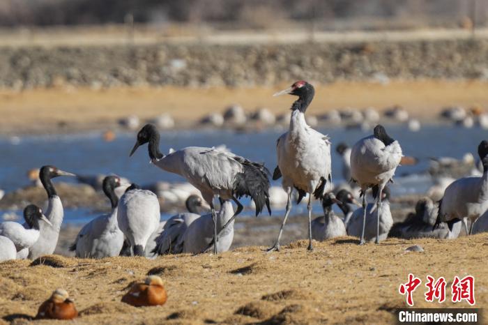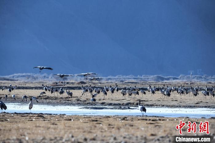 1月10日,西藏雅魯藏布江中游河谷黑頸鶴國家級自然保護區(qū)日喀則片區(qū)拉孜縣曲瑪鄉(xiāng)境內(nèi),大量越冬的黑頸鶴翩翩起舞,在濕地和農(nóng)田間覓食、嬉戲。近年來,隨著國家加大青藏高原生態(tài)保護力度,西藏多措并舉實施生態(tài)建設,廣大農(nóng)牧民民眾保護野生動物的意識不斷提升,黑頸鶴及其棲息地得到了較好的保護,黑頸鶴數(shù)量逐年遞增。據(jù)悉,每年11月至次年3月,日喀則市拉孜縣、謝通門縣、桑珠孜區(qū)等地都會有黑頸鶴在此棲息過冬,最高數(shù)量達到8000只左右。