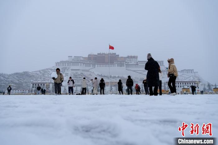 圖為1月18日上午,民眾在拉薩布達拉宮廣場賞雪。江飛波 攝
