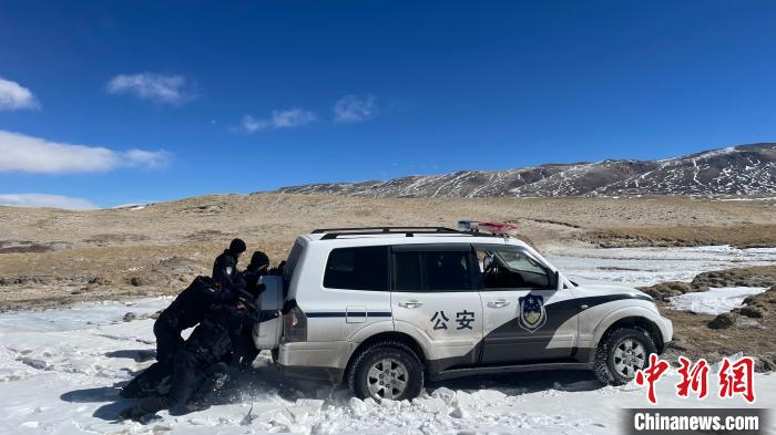 又經(jīng)歷一次陷車后,車輛實在無法前行。簡單吃過自熱午餐后,民警一行帶好裝備開始“步巡”,凜冽的寒風(fēng)似是帶著刀子般往骨頭里鉆,雪地反射的光讓人睜不開眼,此時海拔已將近5000米,氣溫零下23攝氏度。