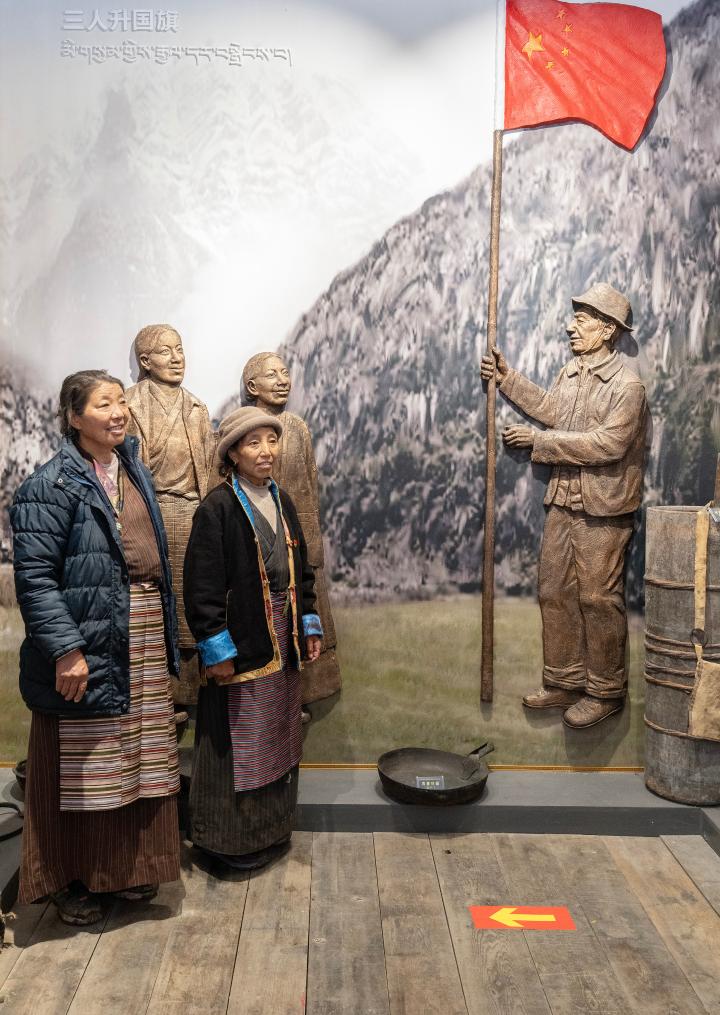 2023年6月10日,卓嘎(右)和央宗在桑杰曲巴故居中與描繪桑杰曲巴用自己縫制的國(guó)旗舉行升旗儀式場(chǎng)景的壁畫前合影。新華社記者 費(fèi)茂華 攝