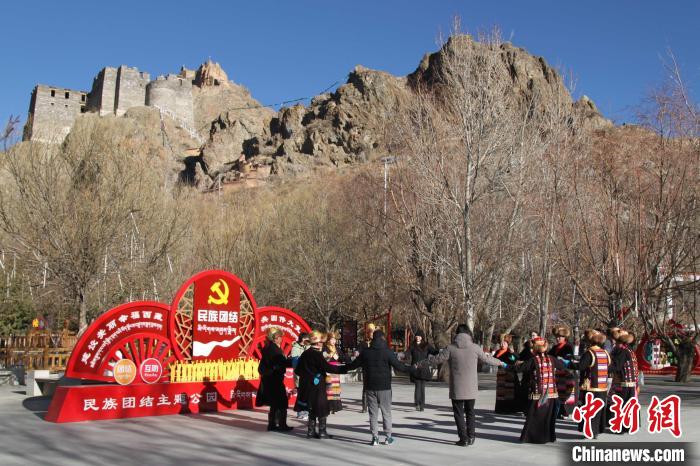 資料圖為援藏干部與民眾在瓊結民族團結主題公園跳鍋莊舞。曲杰 供圖