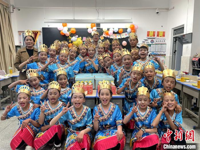 圖為襄陽市“格?;ā敝Ы虉F老師陪瓊結鎮(zhèn)小學孩子們過集體生日。曲杰 供圖