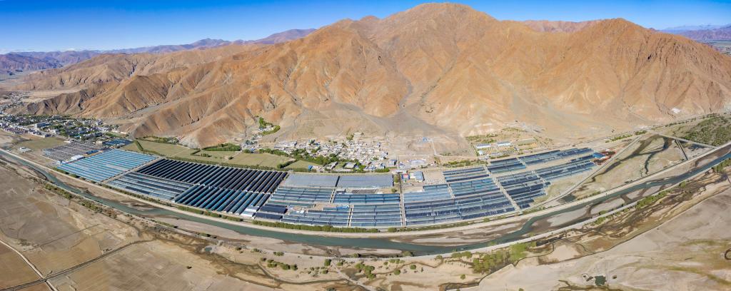 白朗縣日喀則珠峰現(xiàn)代農(nóng)業(yè)科技創(chuàng)新博覽園(無人機(jī)拼接照片,2023年5月28日攝)。新華社記者 姜帆 攝