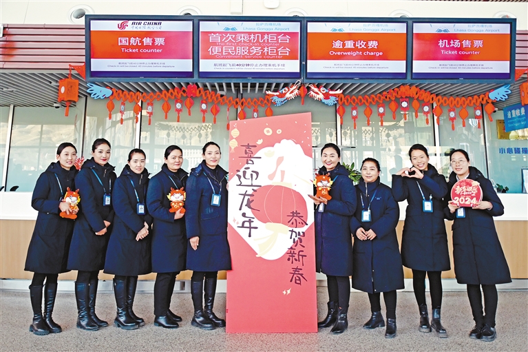 春運期間,西藏民航人為廣大旅客架起歸途的平安天路,保障安全、順暢、高效出行。圖為貢嘎機場旅服部工作人員在航站樓現(xiàn)場為旅客送上新年祝福。