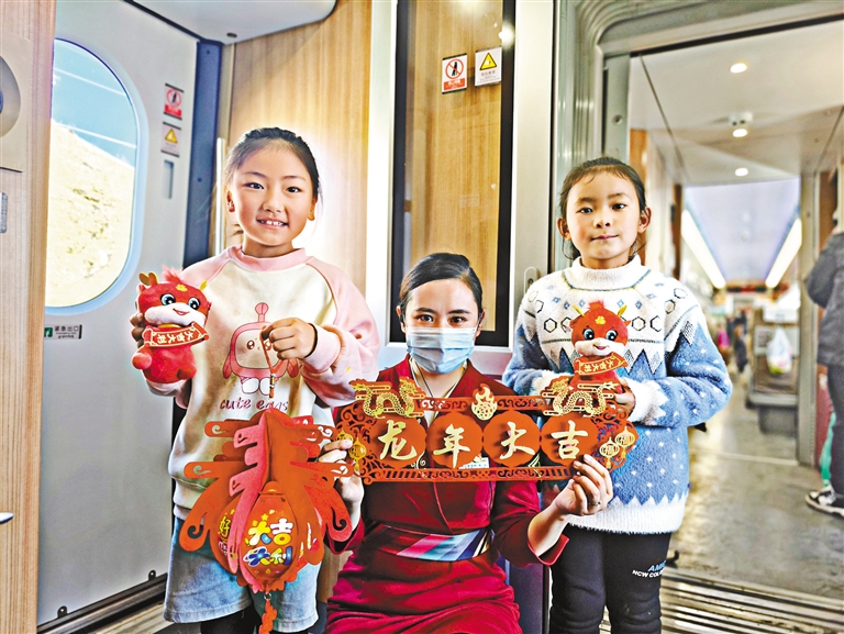 春運期間,鐵路部門踐行“天路格?;ā狈掌放评砟?,將車站、列車裝飾一新,為旅客提供優(yōu)質(zhì)、貼心的服務。圖為拉林鐵路動車組上的乘務員把龍年禮物送給孩子們。