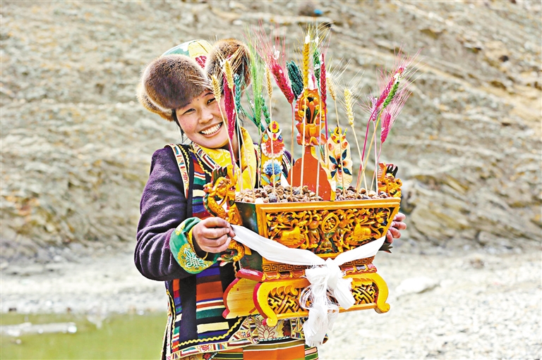 制作“切瑪”盒是藏歷新年一項歷史悠久的習俗,代表著群眾對五谷豐登的美好期盼。圖為瓊結(jié)縣唐布齊村群眾身著節(jié)日盛裝,端出精心制作的“切瑪”盒。