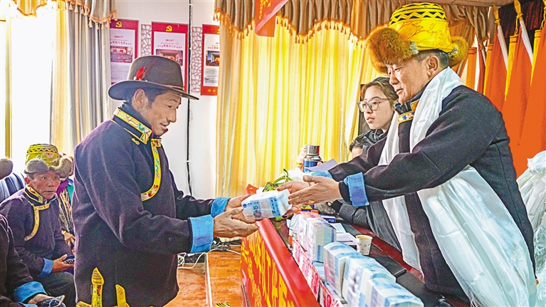 乃東區(qū)頗章鄉(xiāng)布仁村2023年集體經(jīng)濟分紅款達30余萬元,惠及全村101戶群眾。圖為村民在領(lǐng)取分紅款。