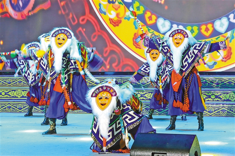 洛扎縣組織縣藝術(shù)團、農(nóng)牧民表演隊等精心舉辦“大地歡歌 美麗洛扎”村晚。圖為村晚上的藏戲表演。