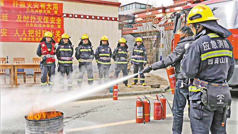 乃東區(qū)消防救援大隊來到乃東街道貢康社區(qū),組織駐村工作隊、網(wǎng)格員、群眾開展消防應急演練,進一步提升群眾火災防范意識和應急處置能力。圖為消防員正在指導群眾進行滅火實操。