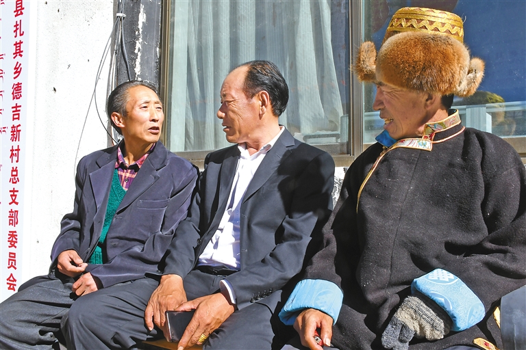 扎囊縣扎其鄉(xiāng)德吉新村,生活著藏族、漢族、土族等不同民族790余名群眾,該村先后榮獲縣級民族團(tuán)結(jié)進(jìn)步模范集體、山南市民族團(tuán)結(jié)進(jìn)步模范單位、自治區(qū)民族團(tuán)結(jié)進(jìn)步模范村(居)等稱號,是山南市遠(yuǎn)近聞名的“團(tuán)結(jié)村”?!D為在德吉新村村委會大院內(nèi),祖籍青海,身著藏裝的村民張積成(右一),與同村不同民族的群眾一起交談。記者 丹增平措 攝