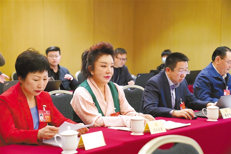 住藏全國政協(xié)委員朗杰拉措(中)在少數(shù)民族界討論時發(fā)言。