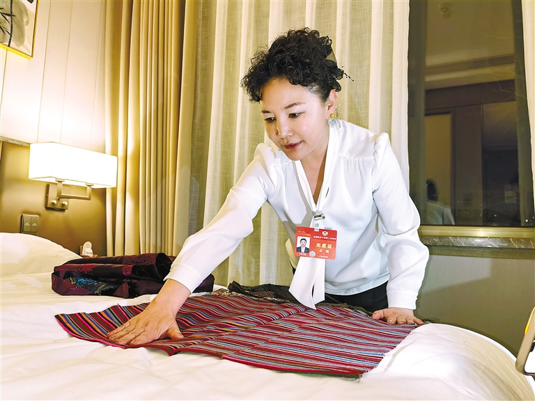 住藏全國政協(xié)委員卓嘎在駐地整理民族服裝。