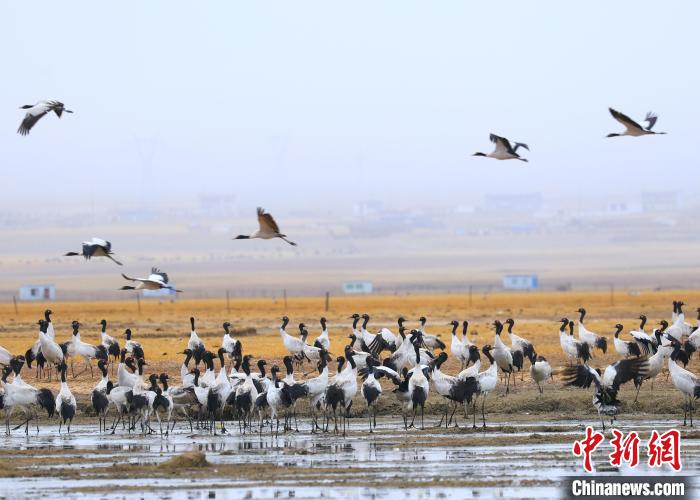 金色的陽光灑在阿熱濕地的草甸上,黑頸鶴們時而展翅翩飛,時而嬉戲覓食,或盤旋在濕地上空,接著在不遠(yuǎn)處停落,或優(yōu)哉游哉地在淺灘處覓食、嬉水、跳舞,呈現(xiàn)出一幅幅鶴舞高原的美景圖,如夢如幻地定格在念青唐古拉山的春天里。