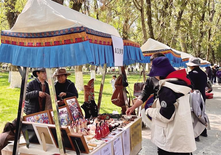 除了文博大講堂和藏戲表演,當日羅布林卡還有文創(chuàng)集市。集市集中了10余類、500余種風格獨特、類型豐富以及具有藝術(shù)性和實用性的創(chuàng)意產(chǎn)品,也是很受大家歡迎。“這次趁著‘五一’假期來拉薩旅游,剛好碰到這場‘文化盛宴’,我覺得很幸運,這種機會很難得。我從集市買了很多文創(chuàng)產(chǎn)品,準備送給家人朋友,以后有機會還要過來。”吳女士說。