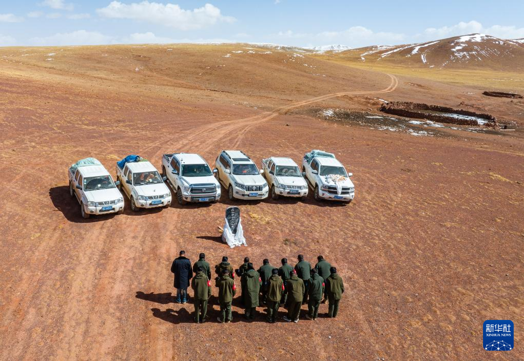 野生動物專業(yè)管護隊員在無人區(qū)深處的羅布玉杰烈士紀(jì)念碑前默哀致敬。羅布玉杰2002年在與盜獵分子的槍戰(zhàn)中犧牲(無人機照片,5月10日攝)。新華社記者 姜帆 攝