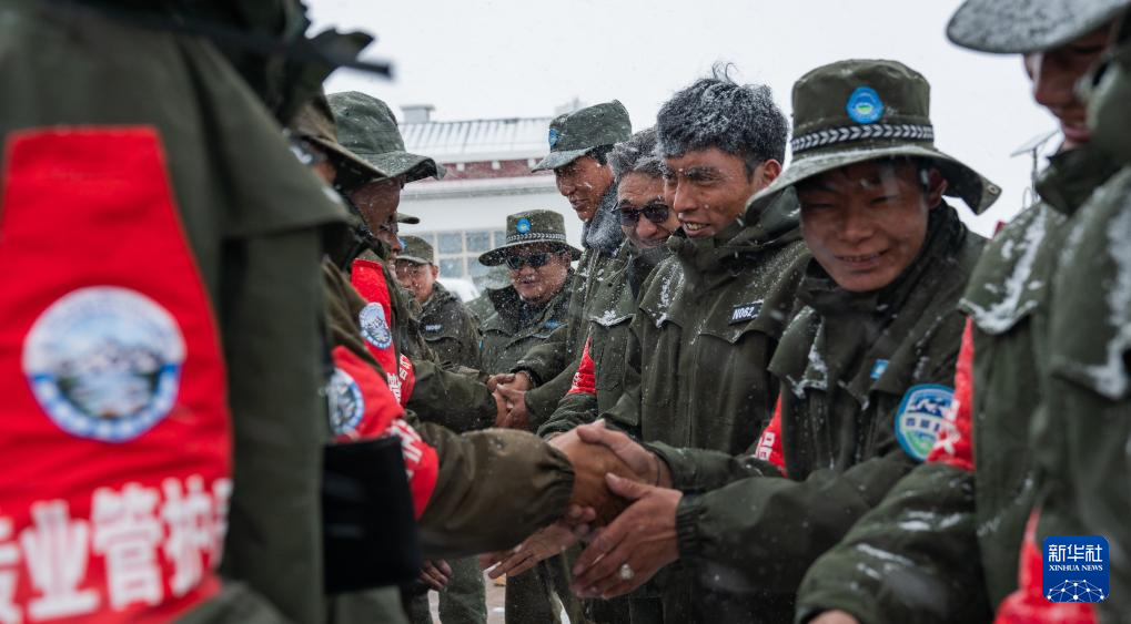 布查玉管護站的野生動物管護隊員們熱情歡迎風(fēng)雪中前來巡護的同事(5月7日攝)。新華社記者 丁增尼達 攝