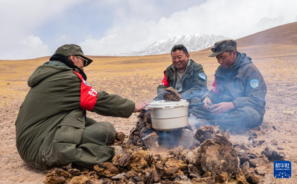 野生動物專業(yè)管護隊員在巡護途中就地取材,用野牦牛糞生火做飯(5月10日攝)。新華社記者 丁增尼達 攝