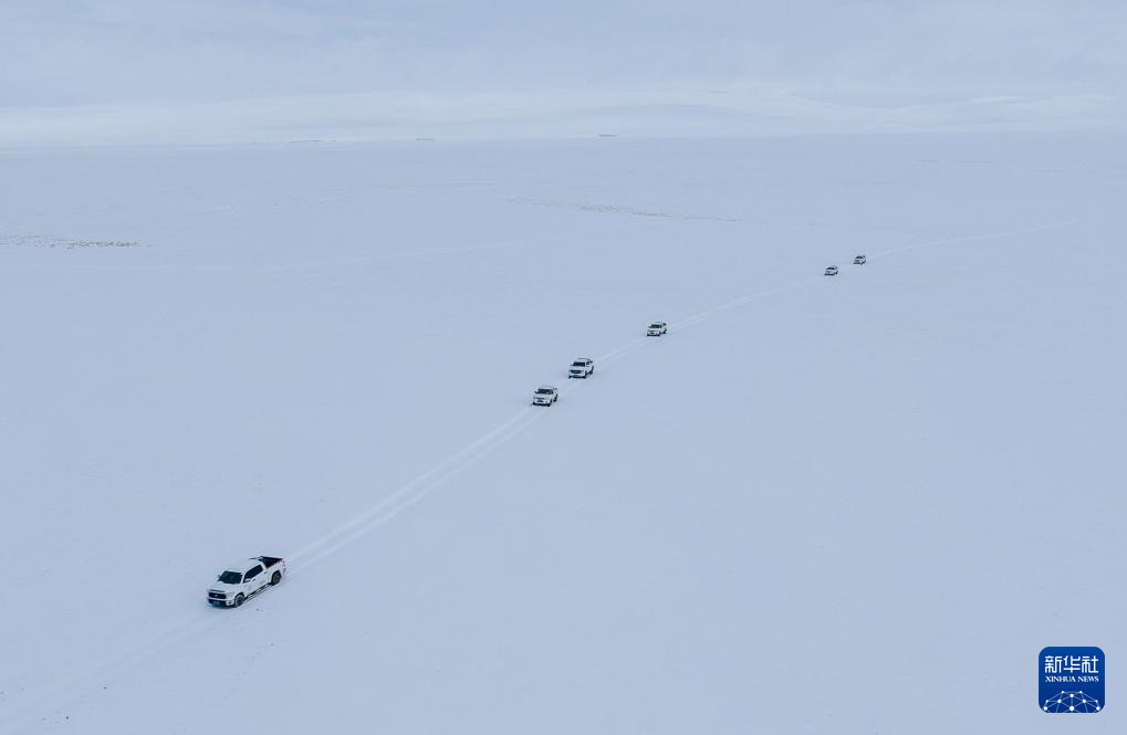 野生動物專業(yè)管護隊員的車隊在大雪中巡護(無人機照片,5月8日攝)。新華社記者 丁增尼達 攝
