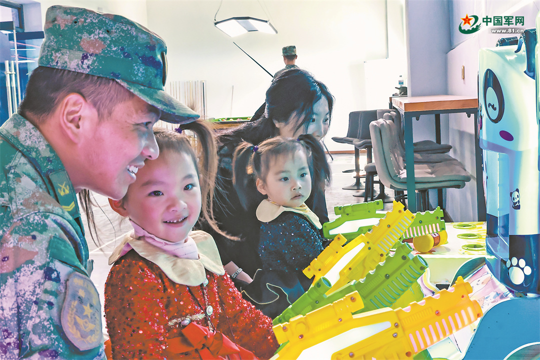 “迷彩叔叔……”剛走進門,盧時芳兩歲半的小女兒王博雅便迫不及待掙脫母親的懷抱,步履蹣跚走向幾個戰(zhàn)士——身為軍娃,小姑娘對身著迷彩的軍人有著天然的親近感。而她4歲的大女兒王馨雅一頭扎進淘氣堡,蹦上跳下。盧時芳見狀,放心地坐在沙發(fā)里,翻開上次還沒看完的書,喝著咖啡,享受難得的愜意時光。