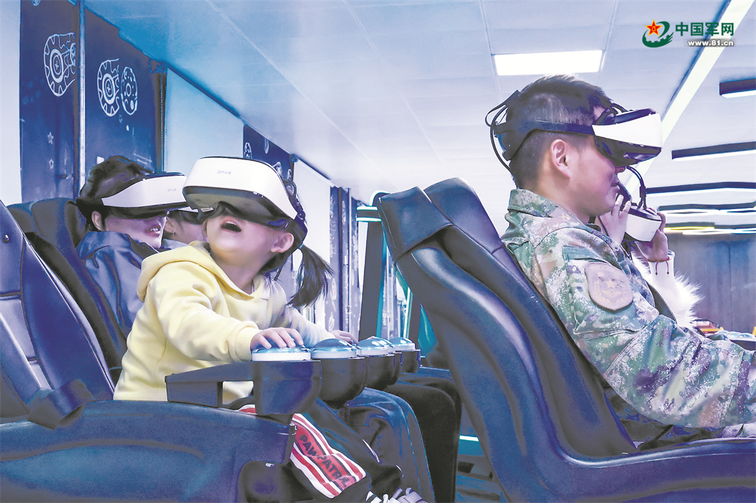 該旅營區(qū)環(huán)境已今非昔比,各種設施日益完善,官兵及其家人在軍營團聚,臉上滿是幸福。該旅官兵帶著家人體驗VR模擬設備。張子欽 攝
