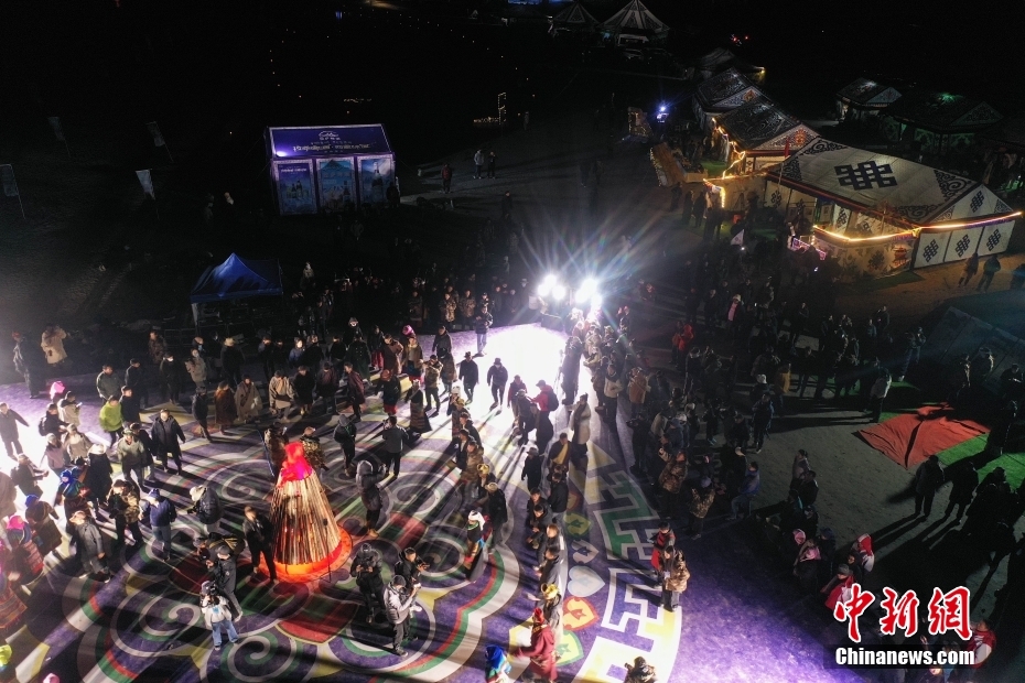5月18日晚,西藏拉薩市當(dāng)雄縣納木錯(cuò)湖畔,當(dāng)?shù)啬撩駧в慰腕w驗(yàn)篝火鍋莊舞。納木錯(cuò),被譽(yù)為“天湖”,吸引著大量游客前來(lái)觀光。圖為篝火鍋莊舞晚會(huì)上的文藝演出。