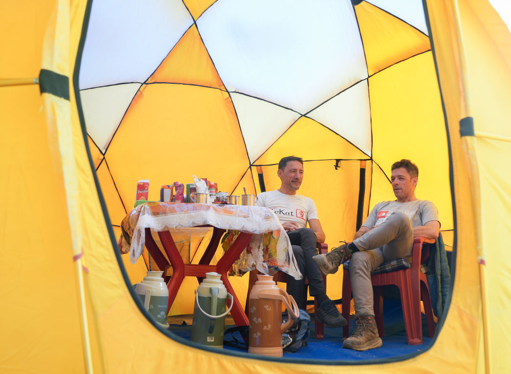 在珠峰登山大本營,德諾埃爾兄弟在帳篷里聊天休息(5月17日攝)。新華社記者 丁汀 攝